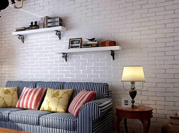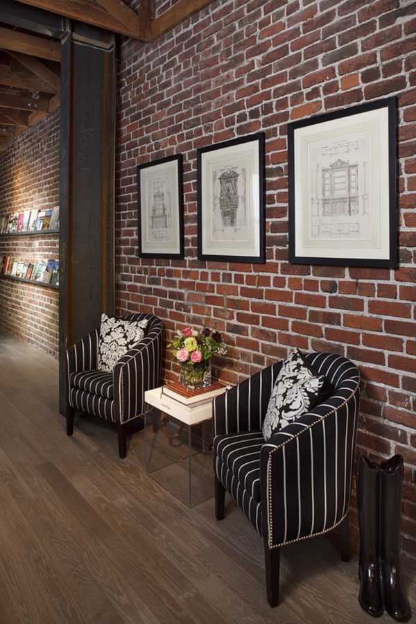 - Использование оригинальной кирпичной кладки стен: достаточно снять со стен все покрытие, обработать кладку грунтом и при необходимости — закрасить швы декоративной краской. Если кирпич красный — не беда, его можно попросту покрасить в белый цвет.
