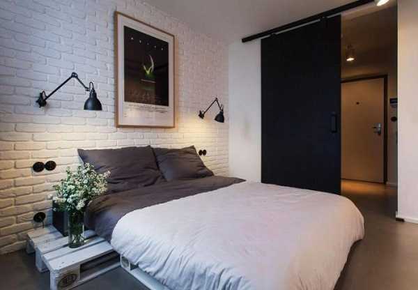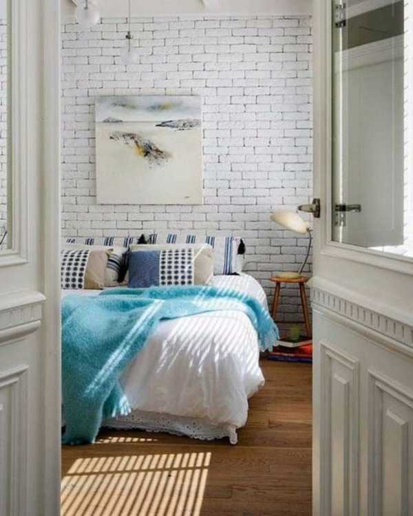 Стена под белый кирпич в интерьере спальни