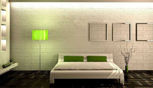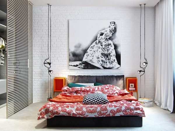 Кладка из белого кирпича или ее имитация в сочетании с текстилем сможет помочь создать в спальне спокойную романтическую атмосферу. Довольно часто нею оформляют стену у изголовья кровати, дополняя ее картинами, как показано на фото, оригинальными светильниками и прочими элементами декора. Стена под белый кирпич в интерьере спальни будет смотреться довольно эффектно, если грамотно подобрать яркий текстиль и контрастную мебель.
