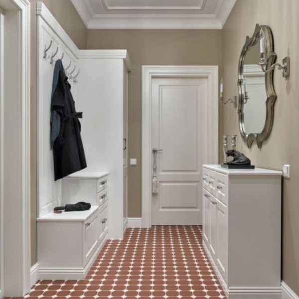 На пол в прихожей рекомендуется положить плитку или паркет. В качестве экономичного варианта допустим ламинат, линолеум. Цветовое решение покрытия лучше выбрать отличное от белого колера. Подойдет бежевый, серый, светло-коричневый цвет.