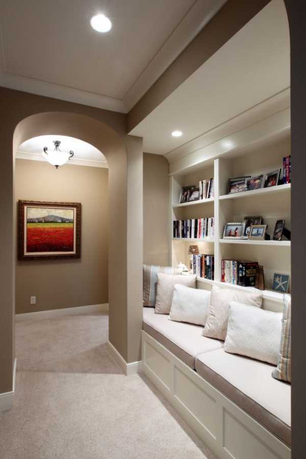 - Близко к комнатам стоит журнальный столик, над ним бра средней мощности. Если пространство позволяет, можно разместить даже небольшую библиотеку.