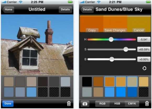 9. Color Change: рейтинг программы – 2.5 звезды, цена – $0.99. Отличное решение для определения цвета комнаты или идентификации цвета на фотографии. Мини-программа подойдет для энтузиастов DIY, фотолюбителей и дизайнеров. Приложение позволяет «поиграться» с цветовой гаммой, осветлить или утемнить имеющийся снимок или его отдельные элементы, добавить или сменить оттенок. И все это – посредством удобного ползунка-слайдера. Отметим, что отличием этого приложения от представленных выше, является возможность смешать несколько оттенков для получения эффекта другого освещения (утро, вечер, сумерки и т.д.) и, как следствие, дополнительного реализма модели.