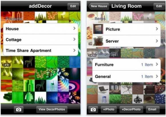 6. addDecor: рейтинг программы – 2 звезды, цена – $3.99. Если вам когда-либо приходилось видеть стенд с примерами окрасок, например, мебели, то вы имеете представление о том, какой он громоздкий и неудобный. Это мини-приложение – ваш компактный стенд. Здесь можно хранить множество вариантов цветов ваших кухонь, столовых, спален и т.д.