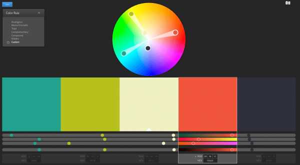 Сервис подбора цветов от Adobe позволяет создать свою палитру при помощи цветового колеса. Значительно упрощает задачу возможность выбрать одну из семи цветовых систем, благодаря чему большая часть схемы создается автоматически. Кроме того, вы можете просмотреть ранее созданные палитры и отобрать наиболее популярные за тот или иной промежуток времени.