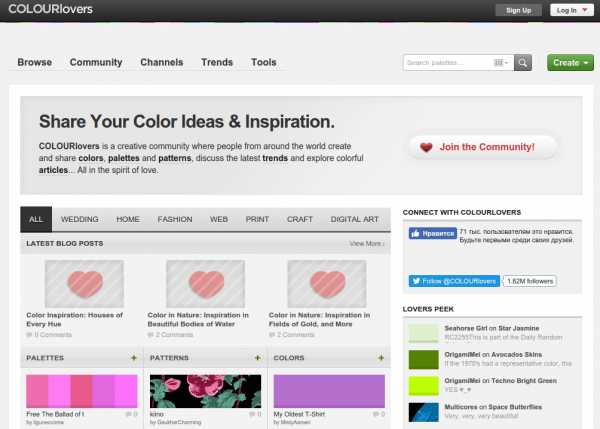 Сайт ColourLovers можно назвать полноправным сообществом людей, так или иначе связанных с творчеством. Здесь можно найти миллионы различных цветов и палитр, а также создать свои наборы. Т.к. каждый зарегистрированный пользователь имеет возможность оценивать и комментировать чужие творения, есть возможность выбрать наиболее популярные цветовые схемы либо те, которые имеют большее количество отзывов. Кроме того, на сайте есть инструмент для получения палитры из готового изображения.