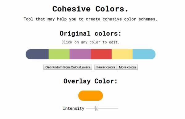 Интересный ресурс, который позволяет любую цветовую схему сделать гармоничнее. Для начала можно создать свою палитру либо выбрать случайную, взятую с сайта Colourlovers. Затем на нее накладывается один цвет и регулируется яркость – готово!