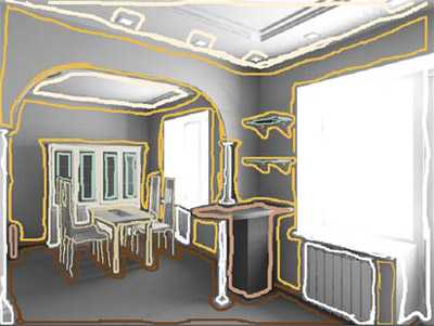 Шаг 3. Для первого цветового решения интерьера выберем бежевый цвет. Обведем все объекты интерьера по контуру разными оттенками бежевого и сочетающимися с ним цветами: