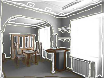 Мы для примера выбрали модель интерьера, выполненную в программе 3ds Max и отрендеренную в черно-белом цвете.