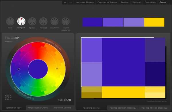 Один из немногих русскоязычных ресурсов для работы с цветом. Доступно шесть различных цветовых систем, позволяющих сгенерировать четырехцветную палитру. Также у пользователя есть возможность увидеть пример веб-страницы, оформленной исходя из созданной цветовой схемы.