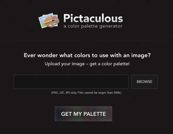 Pictaculous — программа, позволяющий загрузить изображение и получить его цветовую схему. Несмотря на простоту использования, работать в Pictaculous очень удобно, так как он совместим с другими цветовыми программами, например, Kuler, которую мы рассмотрели выше.