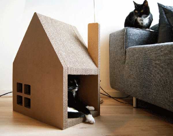 Можно использовать и элементарную конструкцию: выбрать подходящую по размеру коробку, прорезать в ней дверь и окна, оклеить изнутри тканью. Получится легкое в изготовлении и комфортное жилище для мурки.