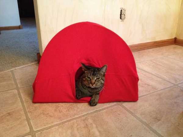 Самая простая конструкция мягкого домика – из футболки (хотите потеплеет? Используйте старый свитер). Для этого требуется коробка по размеру кота. У нее убирается один из торцов, на домик натягивается футболка, чтобы ее горловина совпала с местом, где нет стенки. Этот домик с круглым входом очень удобный и простой в конструировании.