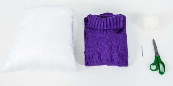 Для создания лежака с бортиками потребуется плоская подушка небольшого размера, подходящая кошке, имеющая синтетический наполнитель, а также материя для декора. Создание включает в следующие этапы: