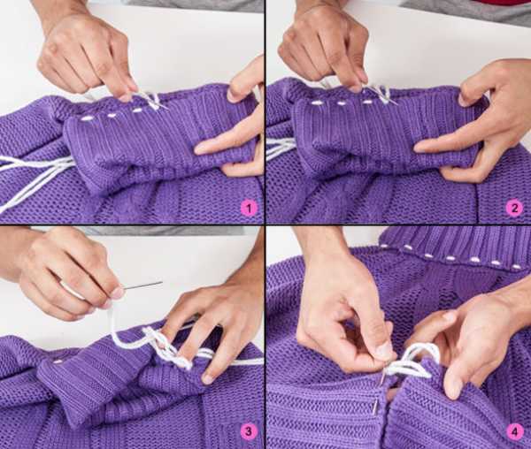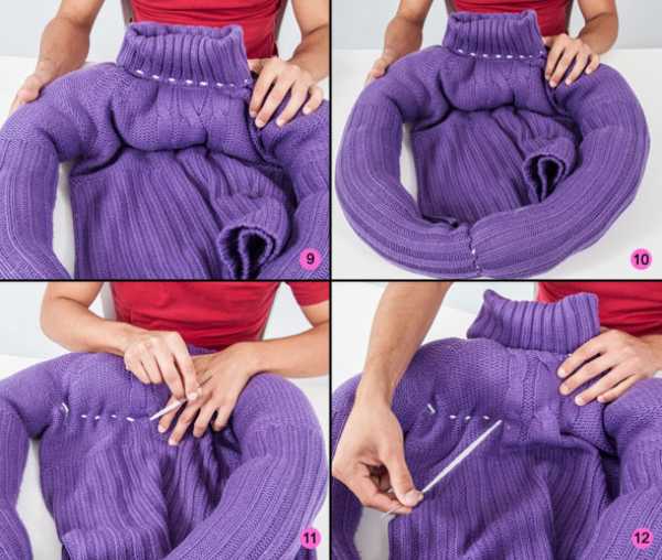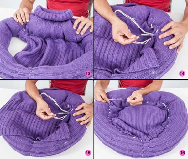 Очень уютной получается лежанка из старого свитера, сшить которую не составит труда. Следует взять свитер, положить его на стол, зашить вырез при помощи заплатки на внутренней стороне. Теперь необходимо пришить рукава к основной части одежды по всей длине, чтобы получился овал. Далее рукава-бортики набиваются ватином или синтепоном, а «дно» утепляется. Затем рукава сшиваются между собой, чтобы замкнуть овал. Получилась отличная лежанка, теплая и уютная, не потребовавшая большого расхода времени и материалов.