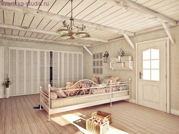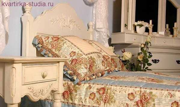 Уютно-нежная спальня в стиле прованс – то, что нужно для полноценного сна. Пастельные тона и природные материалы способствуют ночному отдыху намного лучше, чем характерное для современного дизайна обилие глянцевого пластика. Даже мебель в провинциальном интерьере выглядит по-другому: простой деревянных шкаф с распашными дверцами, в комплекте к нему – комод и тумбы такой же светлой расцветки, устойчивая кровать с кованым либо вырезанным из массива изголовьем, возможно, несколько мягких кресел или стульев, диванчик у изножья кровати, иногда – столик с зеркалом для наведения красоты.