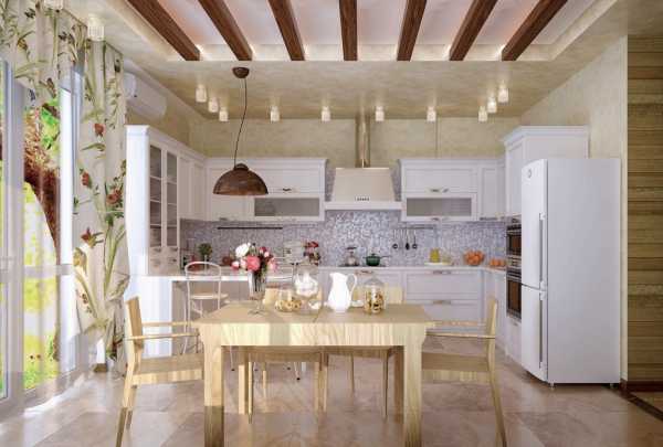 Для дизайна во французском деревенском стиле очень важен стол, который должен быть изготовлен из дерева. На первый взгляд он сделан достаточно грубо, что обычно и подчеркивают в таком дизайне. Однако качество финишной отделки, тщательно подогнанные детали, даже его пропорции свидетельствуют о том, что он изготовлен настоящими мастерами своего дела. На кухне есть выход на балкон. Проем такой же величины, как и шкаф — от потолка до пола. Большое окно совмещено с дверью, а над ними три застекленных блока. Видимо, такая конструкция предусмотрена дизайном и служит для поступления в помещение максимального количества света. Потолок выполнен из деревянных реек темного цвета, разделен на отдельные сегменты. Он гармонично сочетается с абажурами висящих над столом ламп и несколько темнее по тону одной из стен. Вся обстановка весьма сдержана, но особая роль в этом дизайне отведена полу. Он имитирует ковер с небольшими геометрическими узорами, напоминающими известную «розу ветров» и одновременно связывает между собой отдельные цвета, используемые в оформлении.