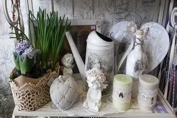 Что касается декоративных предметов, тот обычно это различные фарфоровые, керамические или тканевые безделушки, а также обилие рюшей, шитья и цветочных узоров.