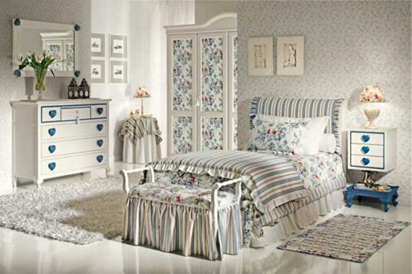 Во французском оформлении спальной комнаты всегда присутствуют простые цветастые обои и текстиль. Стены могут быть отделаны в виде узорчатых панно на однотонном фоне, встречается также обивка деревянной вагонкой, выкрашенной неяркой краской. В стиле прованс нередко используются балдахины над кроватью и светлые занавески на окнах. Ткани применяются легкие, без блеска, преимущественно из хлопка и льна. Постельное белье также должно соответствовать выбранному направлению – предпочтение лучше отдать одноцветным комплектам нейтральных тонов или мелким растительным принтам. Очень хорошо будут смотреться всевозможные оборки и кружева.