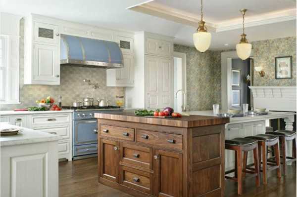 Стиль прованс для оформления кухни предпочитают многие. Если квартира является студией, то зонирование кухни выполняют с помощью отделочных материалов. Например, чтобы визуально выделить кухонный фартук, его делают из плитки более яркого или темного цвета, чем обои. Примером может служить небольшое помещение, выполненное в серовато-голубой гамме. Хотя оно является довольно маленьким, особой тесноты не ощущается. Но сразу видно, что каждый сантиметр свободного пространства, в данном случае использован по максимуму. Высокий, до самого потолка, кухонный шкаф довольно вместителен. А те предметы и посуда, которые в него не поместились, могут быть размещены в навесных шкафчиках, установленных под потолком, над вытяжной вентиляцией.