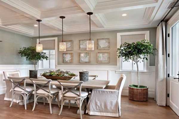 В качестве декора можно использовать пейзажные картины в светлых рамках, диванные подушки на тумбе-пуфике, плетеные подставки. Для отделки подойдет простая светлая краска, обои, искусственный камень-песчаник, беленая кирпичная кладка или деревянная вагонка. Пол лучше всего сделать из керамогранита или матовой напольной плитки неброской расцветки.