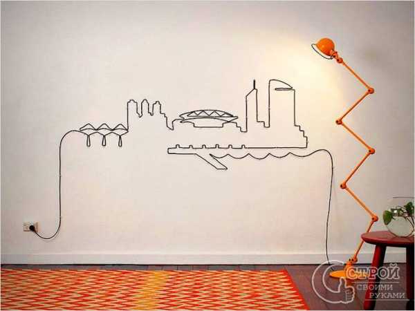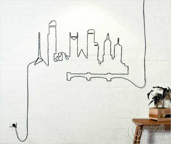 Город из лишних проводовПейзаж. Можно рассмотреть и более сложные варианты. Так на стене можно «нарисовать» оригинальное панно. Главное, это четкий контраст, который позволит выделить задумку.