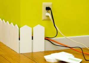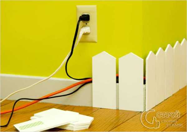 Декоративный заборчик для маскировки проводовЗабор. Любые провода можно закрепить по верху плинтуса. Но, чтобы их замаскировать, можно вырезать небольшие заготовки в виде заборчика, который фиксируют к плинтусу при помощи двухстороннего скотча. Это оригинальная идея для детской комнаты, при этом заборчик можно раскрасить в разные цвета или один определенный.