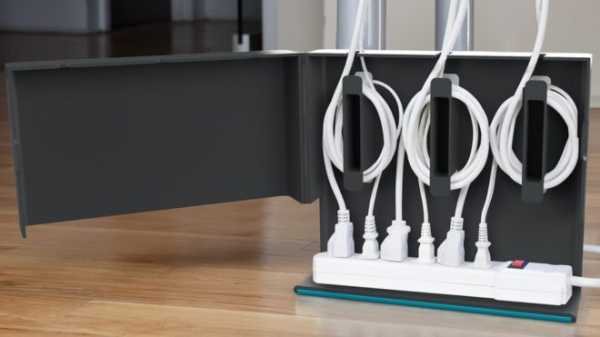 Существуют и готовые решения, например Plug Hub от компании Quirky. Это коробка, изготовленная из жёсткого пластика с прорезиненным дном. Сверху есть три отверстия для кабелей, а внутри — три крепления, на которые можно намотать слишком длинные шнуры. Plug Hub можно поставить на пол или закрепить на стене.