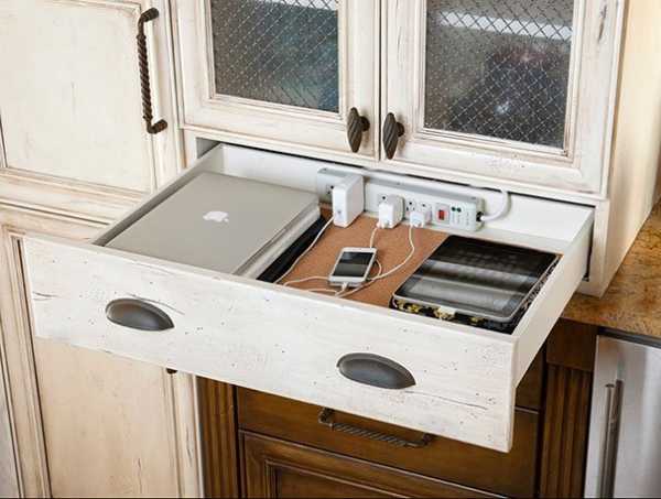Место для зарядки гаджетов замаскировано под выдвижной ящик- В процессе маскировки необходимо каждый вид кабеля промаркировать с обеих сторон. Даже через несколько лет вы не запутаетесь в большом количестве проводов и быстро отыщете необходимый.