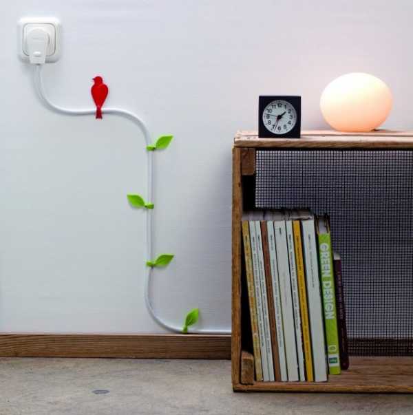 - Творческий подход. Как уже рассматривалось выше, кабель не обязательно куда-то прятать. Один из вариантов — его фиксация к стене с помощью зажимов с последующим «креплением» вырезанной из журнала птички. Если имеются свободные средства, некрасивые зарядники стоит заменить изделиями в более оригинальном исполнении.