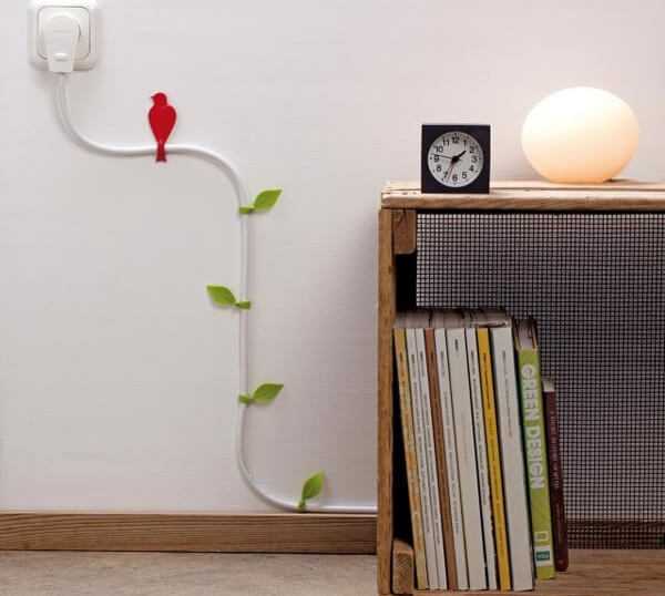 Неплохая идея, как задекорировать, спрятать и украсить электрический кабель, это использовать силиконовые наклейки. Они недорогие и могут вписаться практически в любой дизайн. Подключив фантазию ими можно оформить композицию плетущихся цветов, сидящих птиц и пр.