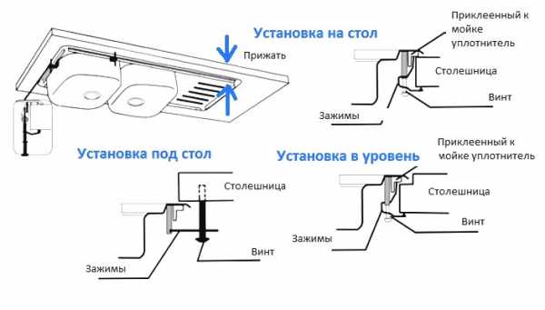 установка врезной мойкикрепление накладной мойкиПодключение сантехники и установка смесителя на оба типа моек равнозначны.