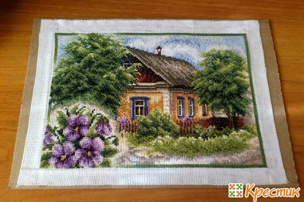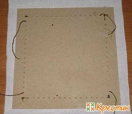 Существует еще один вариант закрепления и оформления вышивки в рамку, дающий возможность почти идеального результата с технической стороны. В этом случае изделие натягивают на достаточно плотный картон нитками. При натяжке происходит выравнивание канвы, и таким образом клетки канвы идут идеально параллельно краю картона, на который она натягивалась.