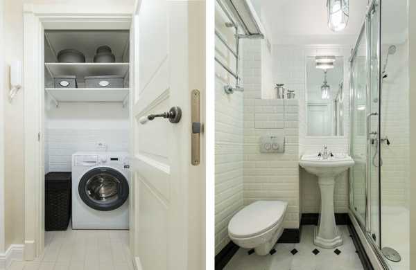 - Вынесение части сантехники в коридор — при надлежащей гидроизоляции часть коридора можно переоборудовать таким образом, что получится дополнение к ванной комнате, где можно поставить стиральную машину или душ.