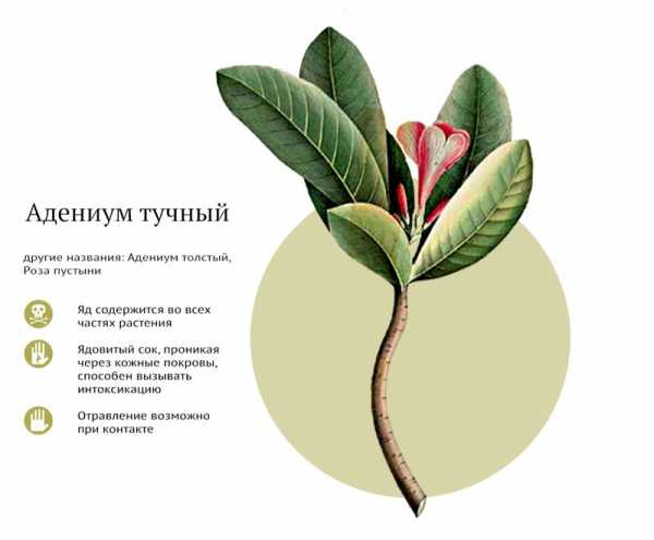 Плющи опасны для домашних животных- Адениум. Это диковинное растение имеет поистине королевский вид и чем-то напоминает деревья бонсай. Большой тучный стебель, похожий на ствол миниатюрного дерева, украшают хрупкие розовые бутоны. Не удивительно, что столь прекрасный вид нередко вводит в заблуждение начинающих цветоводов. Выращивать данный цветок следует с особой осторожностью, ведь его сок является мощнейшим ядом, который способен привести к отравлению и образованию ожогов.