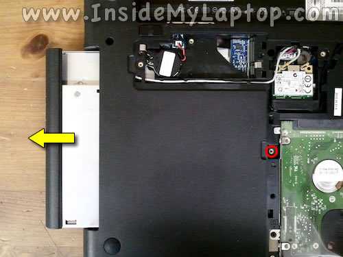 Открутите помеченный шуруп и потяните DVD-привод в направлении указанном стрелкой.