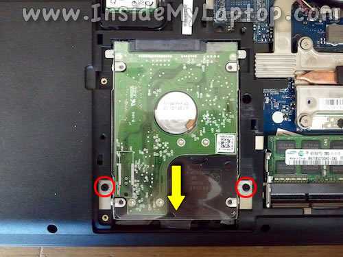 Открутите шурупы удерживающие жесткий диск, сдвиньте его в направлении по стрелке.