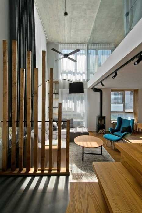 Простой и очень крутой интерьер трансформирован с помощью деревянной перегородки.