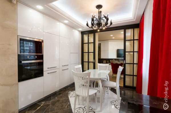Такой вариант на современной кухне смотрится стильно, но может быть непрактичен. Приходится выбирать между низким расположением духовки (что тоже неудобно) и высоким расположением СВЧ-печи.
