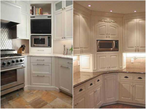 Это идеальный вариант для большой кухни, в которой есть много неиспользованных угловых поверхностей. В этом случае микроволновка заполнит пустое пространство и будет обращена фасадом в другое помещение.