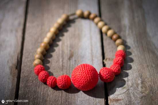 Для детей, недавно появившихся на свет, можно сделать интересные и простые бусы из капроновой нитки, ткани и пряжи. За основу берут обычные бусины, отличающиеся по размеру.
