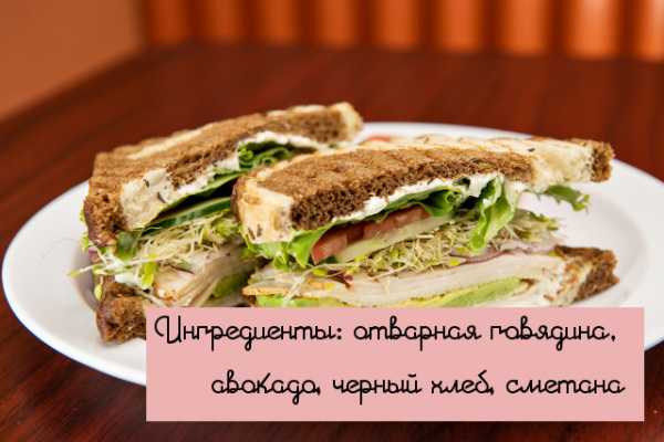 Ингредиенты: грамм 150 вареной говядины (или можно с индюшатиной), авокадо, пол-лимона, 4 ломтика черного хлеба, пару ложек сметаны, соль. По желанию: кисленький соус, помидоры, зелень.