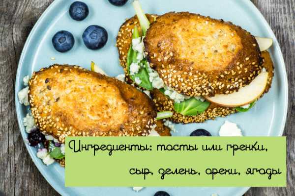 Ингредиенты: тосты или гренки, кусок сыра (лучше “вонюченького”, но можно какой есть), пара груш, зелень (руккола, шпинат или салат). Можно еще грецкие орехи или ягоды для пущей красоты.