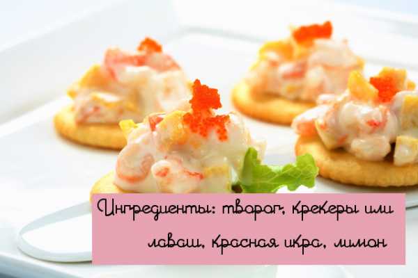Ингредиенты: грамм 200 нежирного творога, грамм 150 красной икры, кусочек лимона, можно маслины. Плюс крекеры или лаваш.
