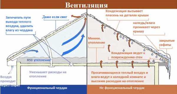 Проветривание чердака в частном доме проводится посредством специальных слуховых окон, через вытяжные отверстия в коньке крыши и приточные под карнизом.