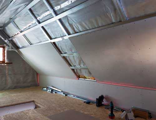 На финишном этапе потребуются малярные инструменты и для штукатурных работ. Следует позаботиться о пароизоляции. Лучшим вариантом станет использование плёнки с фольгой из алюминия. Она обладает отражающими свойствами и повышенными парозащитными, что немаловажно для утепления крыши домов. Michail RybakovТеперь дело за креплением гипсокартонных листов и финишной отделкой. Перед поклейкой обоев или покраской следует заделать швы между листами. Для этого можно использовать специальную ленту из стекловолокна. Стыки проклеиваются лентой и шпаклюются. «Штукатурим правильно» Когда швы окончательно высохнут, необходимо будет прошпаклевать листы гипсокартона по всей плоскости, затем зачистить мелкой наждачной бумагой и прогрунтовать. В результате получится идеально ровная поверхность, на которую можно смело клеить обои или покрасить в понравившийся цвет. Идеи для дома можно воплотить в жизнь самые невероятные — главное немного фантазии, любви и желания. «Выбираем обои для стен» «Жидкие обои для уютного интерьера» «Клейка обоев от «А» до «Я»» «Простота и особенности технологии нанесения жидких обоев.» «Обои на потолок. Выбираем, клеим, красим» «Уникальный материал — жидкие обои на потолок» «Некоторые нюансы выбора обоев под покраску»