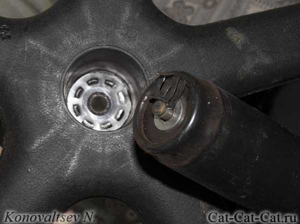 - Снимаем стопор газ патрона. Стопорная клипса находится в центре углубления для патрона, её нужно аккуратно поддеть отвёрткой и снять её. Затем нужно снять шайбу и отложить в сторону вместе с клипсой. Теперь отсоединяем шток газового лифта. Осторожней! Внутри стакана могут прилипнуть к смазке детали газлифта: 2 шайбы и сальник с подшипником. Отложите их в сторону и не перепутайте с шайбой стопора при сборке.