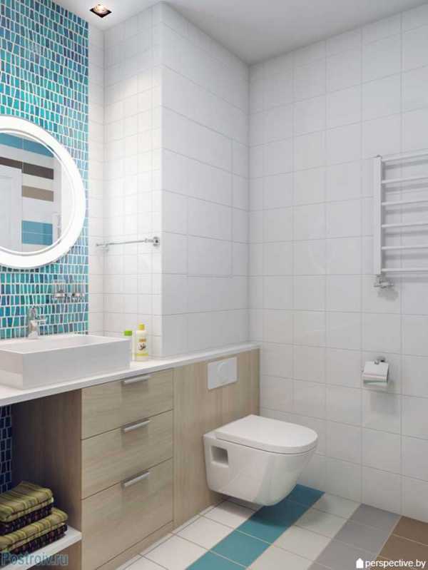 Так как ванная комната в таких квартирах также имеет маленький размер, то для ее отделки используют плиточные элементы светлых оттенков. Для придания помещению объема можно разбавить дизайн плиточками – «кабанчик» другого тона. На полу выкладывают плитку приятного оттенка беж.