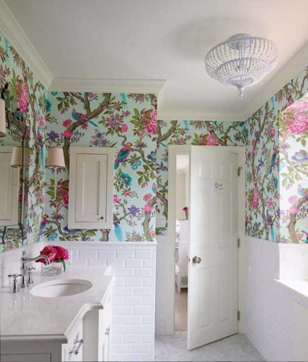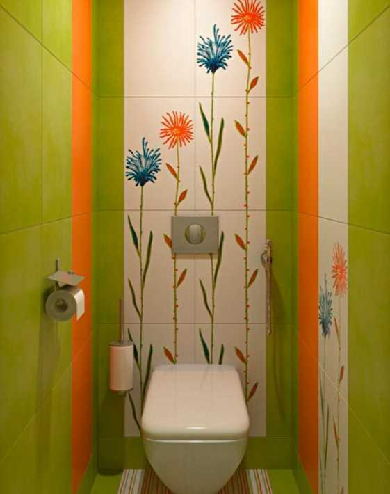 Выбирая активный рисунок для стен, откажитесь от навесных шкафов в туалете.