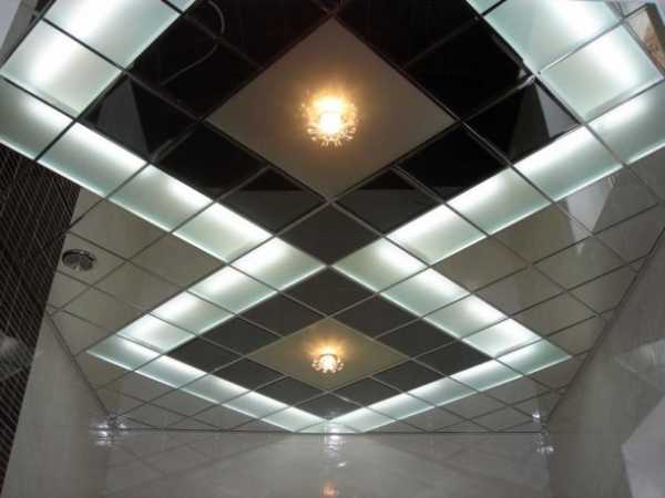 - Зеркальная плитка. Отделка потолка плиткой с зеркальным эффектом поможет увеличить пространство в высоту и придать помещению особую привлекательность. Можно декорировать зеркальным покрытием отдельные фрагменты поверхности – оформить ромбовидные или прямоугольные вставки вокруг светильников, выложить узкими полосами вдоль стыков со стенами.