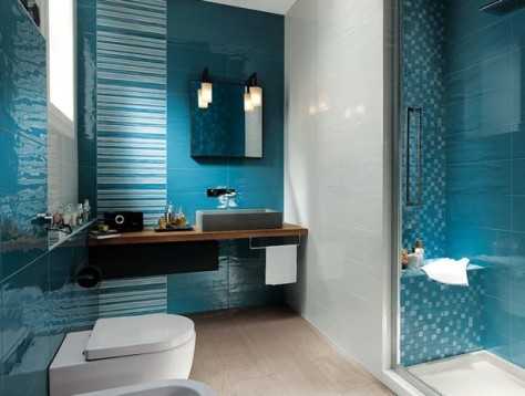 В случае отделки кафелем всей поверхности стен, оживить и украсить покрытие можно с помощью декоративных бордюров и вставок. А используя плитку различных цветов, зрительно исправить неудачную геометрию помещения.